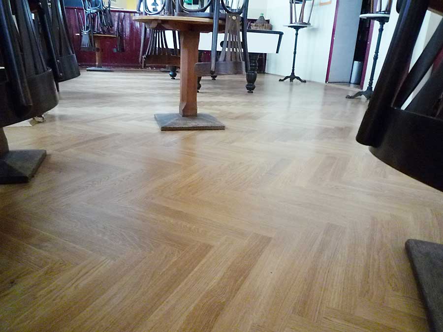 Gastwirtschaft: Massivholzparkett Eiche Fischgrät; lackiert
