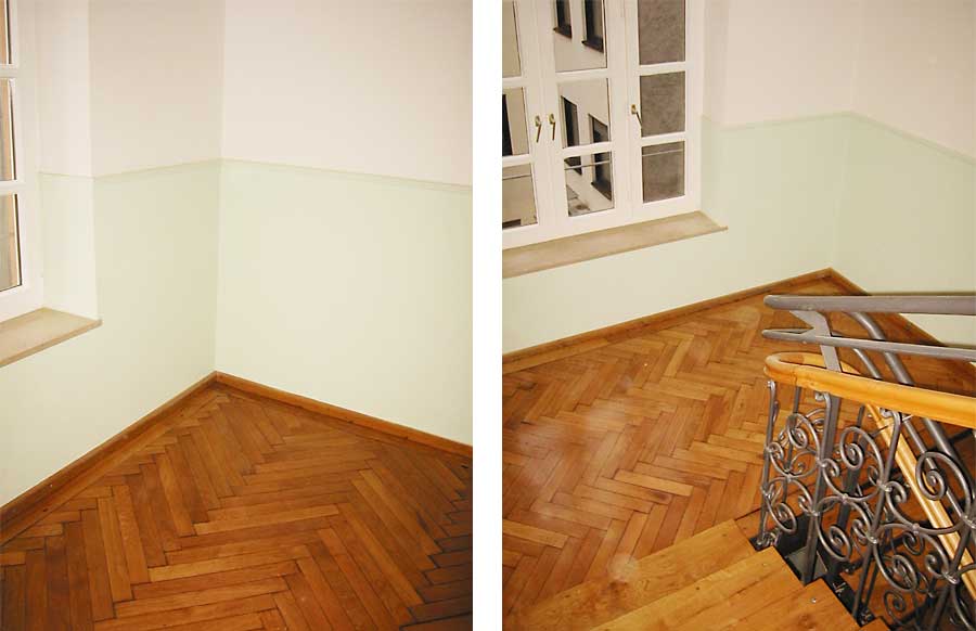 Nach einer Komplettsanierung oder nach dem Ausbessern und der Reparatur von einzelnen Treppenelementen muss das Treppenhaus neu abgeschliffen und die Oberfläche konserviert und versiegelt werden. Dabei liegt ein besonderes Augenmerk auf der Lackierung der Treppenstufen und Podeste: Ein dauerhafter Abriebschutz muss durch die Oberflächenbehandlung gewährleistet werden.